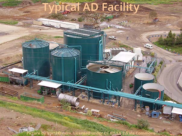 - An anaerobic digester (AD) is usually a large commercial facility that converts organic waste to heat and electricity.