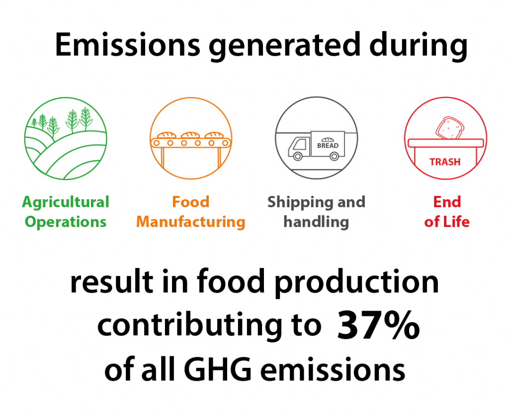 Strategies for mitigating GHG emissions will vary by industry, but organizations that are heavy generators of food-related waste will have to take steps to manage sourcing and waste disposal. Research indicates that food production contributes approximately 37% of global GHG emissions due to emissions generated during agricultural operations, food manufacturing, the transportation of goods to stores and end users, and emissions generated at end of life.