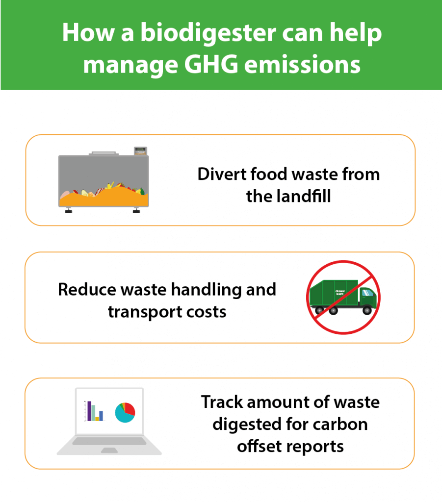 There are several ways in which an on-site biodigester can help organizations gain greater control over their GHG emissions: