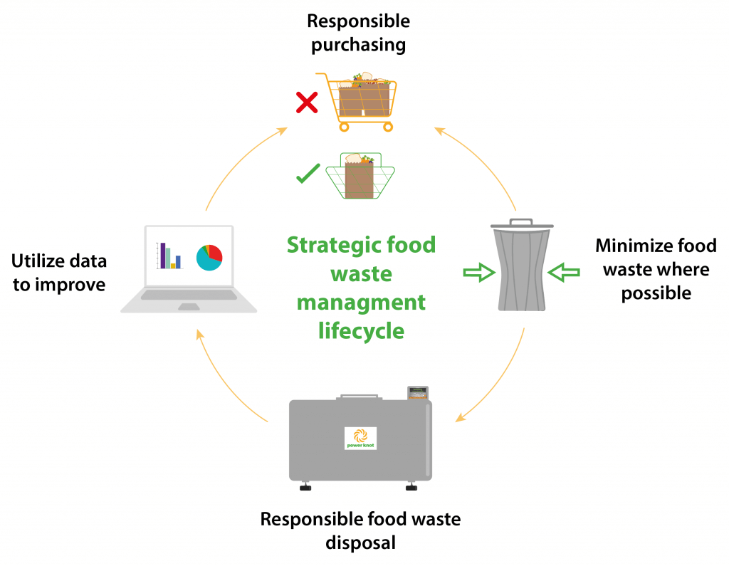 Strategic food waste management requires a systematic approach to the entire life cycle. It must begin with responsible food purchasing, but must also embrace opportunities to minimize waste along the entire life cycle, ending with responsible disposal.