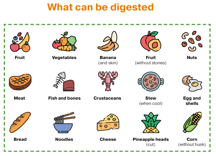 Biodigester can digest anything that a human stomach can. While certain items may take somewhat longer to digest, in general the items listed below can be put broken down by an on-site aerobic biodigester: