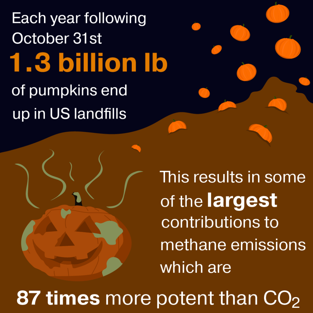 While carving pumpkins is an age old tradition, proper disposal of the waste is a new lesson to be learned. According to the Environmental Protection Agency (EPA), 1.3 billion lb of pumpkins are tossed after October 31st and end up in US landfills every year. This extra organic waste unfortunately results in some of the largest contributions to methane emissions. When organic waste decomposes, it results in methane gas which is 87 times more potent than carbon dioxide over a 20 year period.