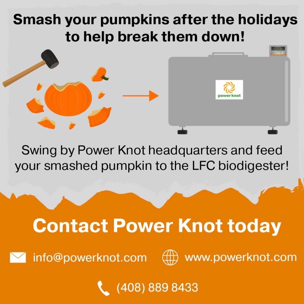 Power Knot headquarters in Fremont, CA is conditionally accepting pumpkin waste from residents and businesses in the Bay Area. If you are interested in learning more about how you can facilitate organic waste management onsite at your facility, contact us today.