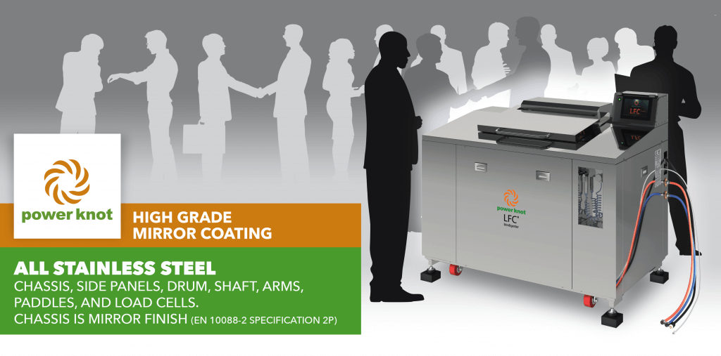 Many attendees stopped by the Power Knot booth due to the unique stainless steel finish on the LFC biodigester. The LFC biodigester is a machine that uses a natural process called aerobic digestion to turn food waste into water. The stainless steel mirror coating is a high grade finish that allows operators to easily clean the exterior and interior of the machine. It is antimicrobial and waterproof.