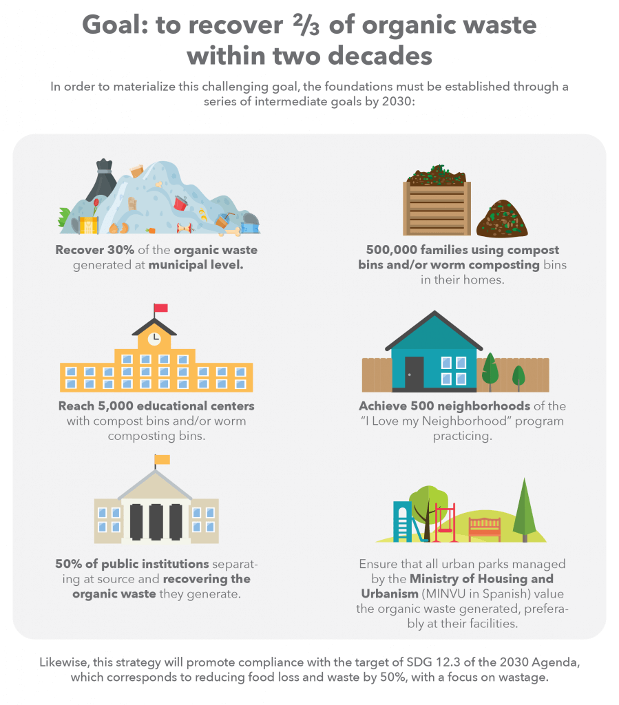 In February 2021, Chile approved a National Organic Waste Strategy that sets a goal of increasing municipal organic waste recovery from 1% to 30% by 2030 and 66% by 2040. Composting and food waste reduction efforts are central to this plan. This is done through both public education and higher fees for the disposal of waste. The strategy aims to gradually increase fees on household waste collection and tax industrial waste disposed at landfills. In addition to composting initiatives, the country is deploying anaerobic digesters at landfills coupled with biogas capture solutions.