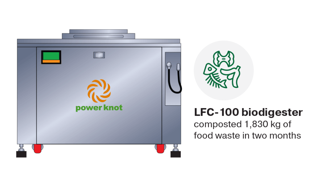 In two months, the biodigester managed 1,830 kg of food waste. The wastewater byproduct is being used to irrigate the hotel landscaping.