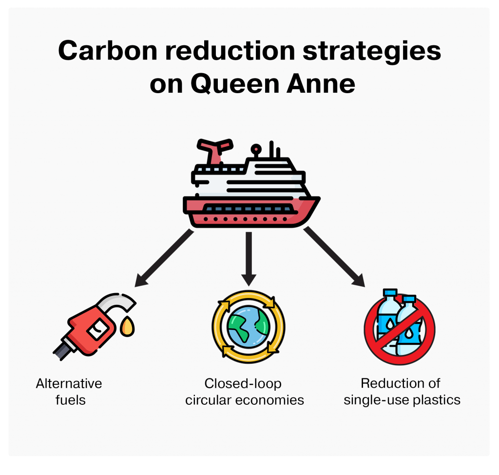 The Queen Anne is focused on reducing its carbon footprint through various innovative methods. These include testing alternative fuels and cutting-edge technology, implementing closed-loop circular economies, and actively working to reduce and eliminate non-essential single-use plastics.