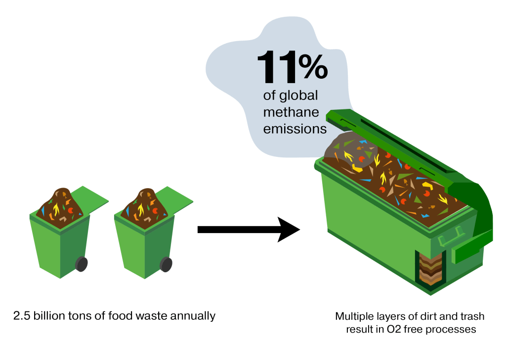 The impact of food waste only increases when it is sent to landfills. While the emissions generated in transporting waste has its own impact, it’s the landfill decomposition process that is truly problematic. As waste piles up, or landfills are sealed, organic waste is left to decompose in an oxygen-free process. When oxygen isn’t available, the decomposition process emits byproducts that include methane.