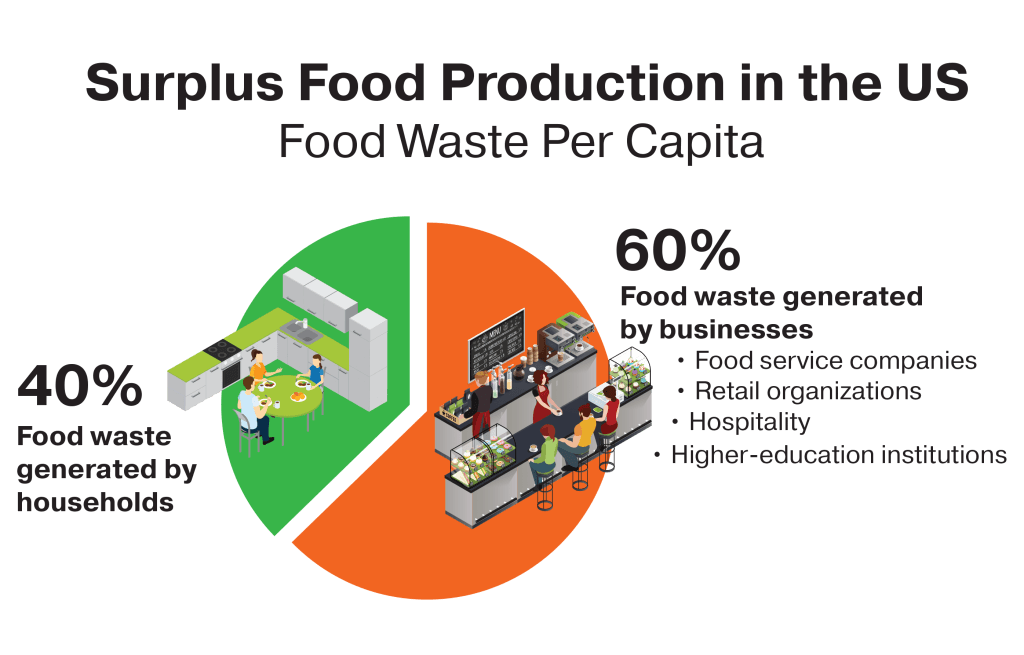 The EPA, USDA, and other organizations tracking food waste have broken the problem down by source to better understand barriers. EPA data attributes 40% of food waste to residential households, with the greater 60% of food waste generated by larger food-producing organizations, including foodservice companies, retail organizations, hospitality, and higher-education institutions. A diverse range of solutions is needed to address the needs and concerns of consumers and organizations.