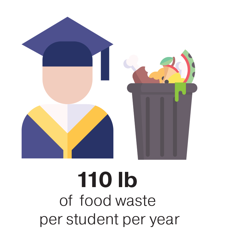 Waste is also a challenge among older students. A study by the National Resource Defense Council estimated that U.S. college students generate approximately 110 pounds of edible food waste per student per year.