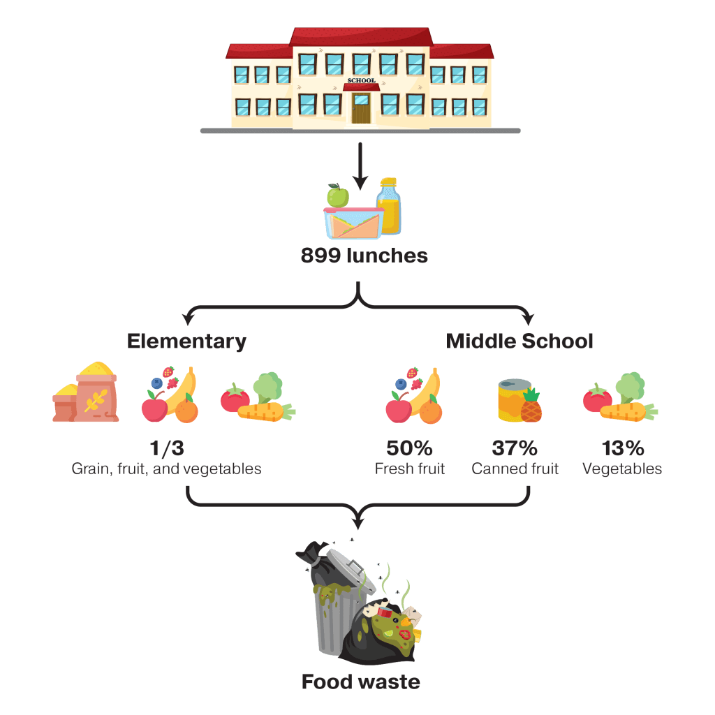 A study at a private school in Missouri found that its elementary, middle, and high school students wasted between 28% and 53% of their food by weight. This study further broke down the types of waste – primarily fruit and vegetable – and attributed food procurement practices as the cause of 85% of the food waste.