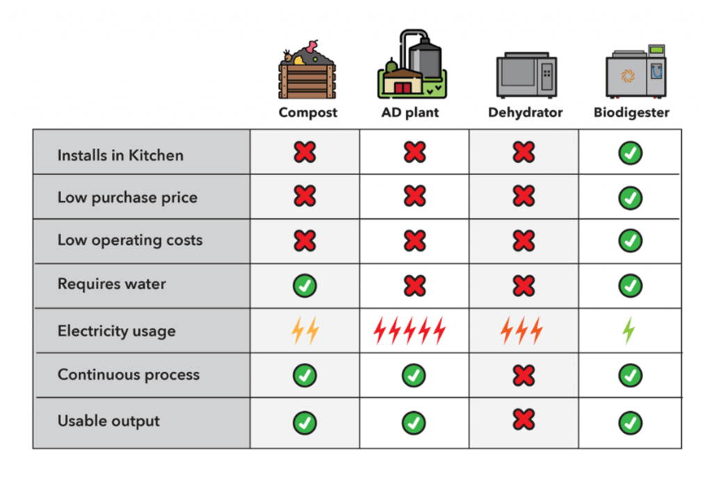 Aerobic digestion is suitable for businesses seeking on-site, environmentally friendly waste management solutions. These machines use aerobic digestion to break down food waste into grey water for easy disposal. With a wide capacity range and a daily energy consumption of 14 kWh, the estimated cost to process one ton of food waste using the LFC biodigester from Power Knot is approximately $5.50, based on PG&E’s 2024 discounted business rates for electricity.