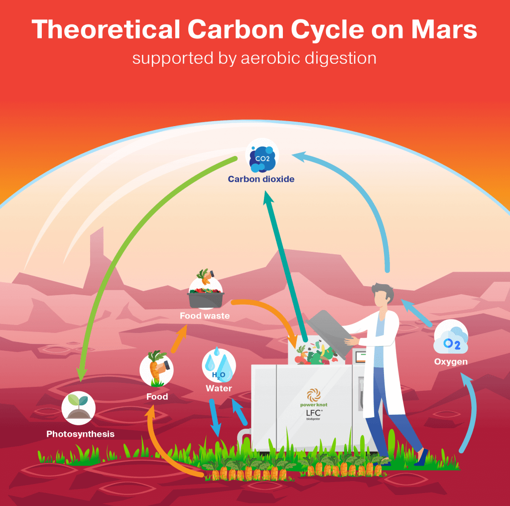 One potential future solution is Power Knot’s LFC biodigester, an aerobic digester. Unlike anaerobic digesters, which do not require oxygen and are well-suited to certain conditions in space, aerobic digesters could play a crucial role if space travel and planetary atmospheres can support the use of oxygen. Aerobic digesters break down organic material using oxygen, creating a cycle that not only reduces waste but also produces water and carbon dioxide. This carbon dioxide could potentially be used to build an atmosphere on other planets, aiding in the creation of habitable environments.