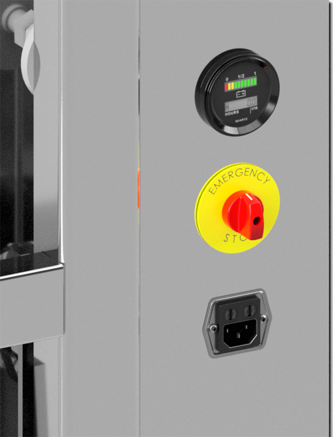 The SBT-360 bin tipper can lift up to 140 kg (300 lb) and deposit the contents into a gaylord container from 80 cm to 120 cm (32” to 47”) tall. The machine can tip bins varying in sizes from 90 litre to 360 litre (24 gallon to 96 gallon).